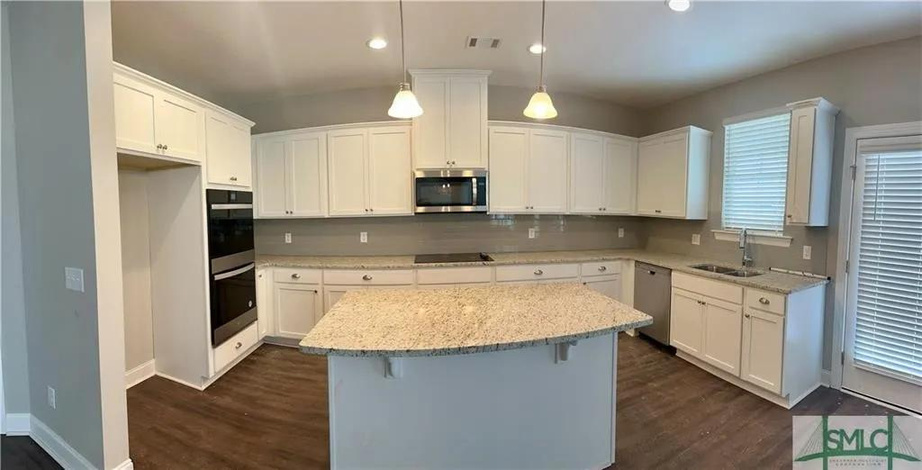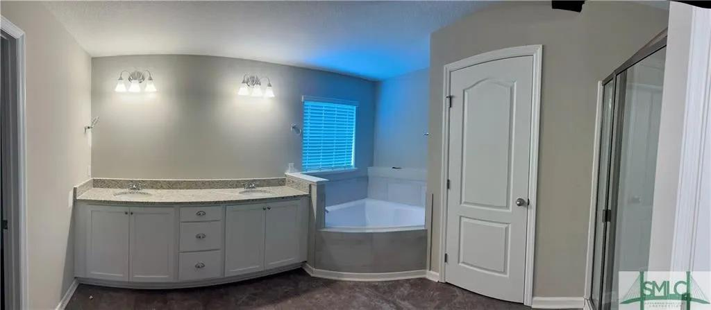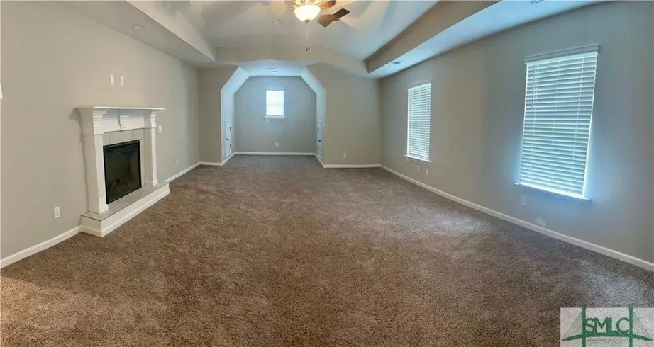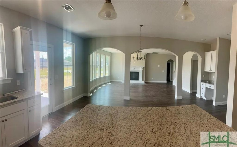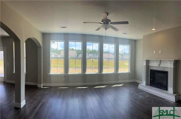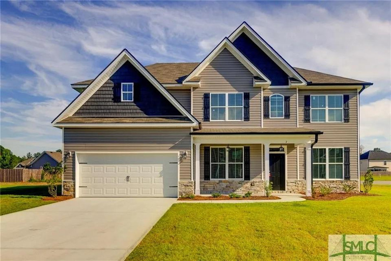 Welcome to Mossy Hollow! Step into the 3450 plan by Faircloth Homes of Savannah, boasting 5 bedrooms and 3 full bathrooms, nestled on a spacious corner lot. Upon entry, you'll fall in love the elegant formal dining room featuring a coffered ceiling, & a versatile formal living room/study adorned w/ French doors. The Great Room charms w/ an arched wall of windows, seamlessly flowing into the breakfast room and kitchen. The kitchen showcases granite countertops, a backsplash, large island, and pantry. Downstairs, find a bedroom and full bathroom for convenience. Upstairs, retreat to the oversized primary bedroom w/ an electric fireplace and sitting area. The primary bathroom offers dual vanities, granite countertops, a separate shower, tub, & a walk-in closet. 3 additional bedrooms, another full bathroom, a laundry room, & a media room/bonus room complete the upper level. Outside, enjoy the rear concrete patio w/ a ceiling fan, 2-inch faux wood blinds, gutters & an irrigation system.